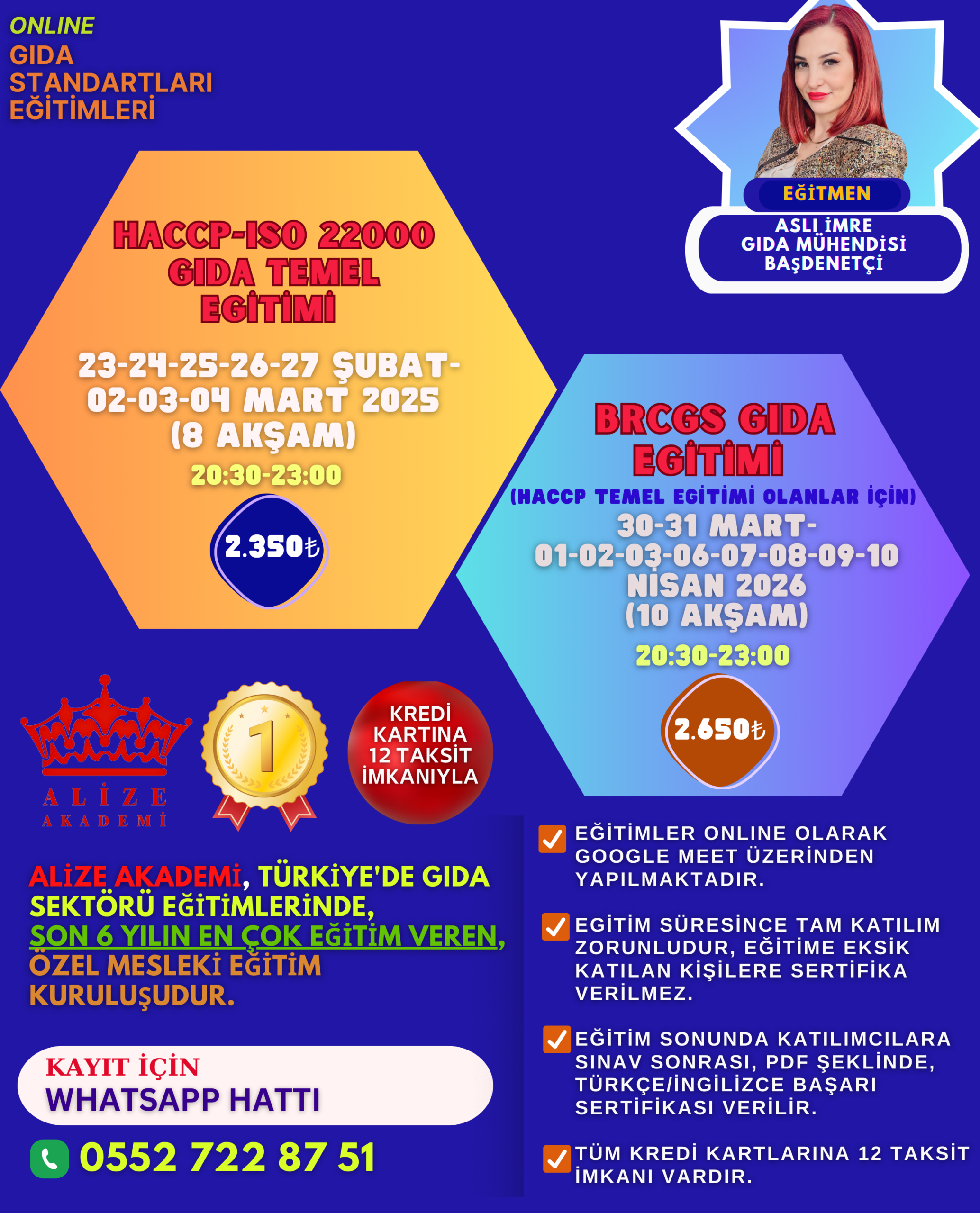 - HACCP, ISO 22000, BRC, IFS, FSSC 22000 gibi Standart Eğitimlerini, gıda mühendisliği 3. sınıftan ya da gıda teknikerliği son sınıftan itibaren herkes alabilir.